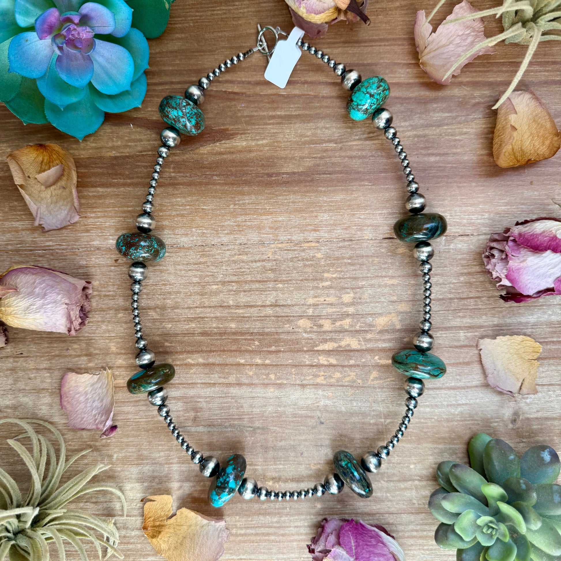 Each turquoise rondelle showcases natural color and matrix, making this necklace truly one of a kind.